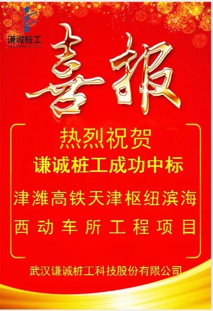 1月15日,公司北京辦事處傳來喜訊:謙誠樁工成功中標(biāo)中鐵二局集團(tuán)有限公司津?yàn)H高鐵天津樞紐濱海西動車所軟基工程1標(biāo)項(xiàng)目!