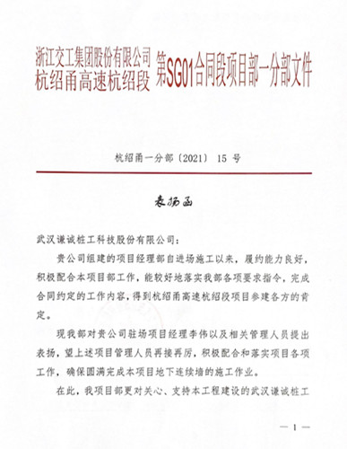 本站訊 3月9日,來(lái)自總包方浙江交工的一封表?yè)P(yáng)函翩然而至,交到了謙誠(chéng)樁工杭紹甬高速項(xiàng)目團(tuán)隊(duì)手中。函中指出:謙誠(chéng)樁工項(xiàng)目團(tuán)隊(duì)自進(jìn)場(chǎng)施工以來(lái),履約...