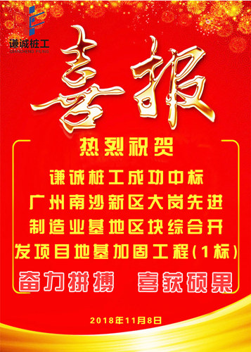 本站訊 11月8日,謙誠樁工華南區(qū)域總部收到中鐵隧道集團三處有限公司發(fā)放的中標通知書,我司喜中廣州南沙新區(qū)大崗先進制造業(yè)基地區(qū)塊綜合開發(fā)項目(1標)工程攪拌樁及管樁施工工程。