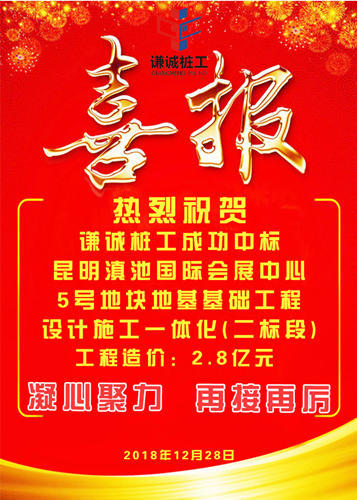 本站訊 12月28日,謙誠(chéng)樁工華西區(qū)域總部傳來(lái)喜訊:經(jīng)過(guò)為時(shí)兩個(gè)多月不分晝夜的努力奮戰(zhàn)和與多家實(shí)力雄厚同業(yè)單位的激烈競(jìng)標(biāo),我司成功中標(biāo)昆明滇池國(guó)際會(huì)展中心5號(hào)地塊地基基礎(chǔ)工程設(shè)計(jì)施工一體化(二標(biāo)段)項(xiàng)目,工程造價(jià)約2.8億元。