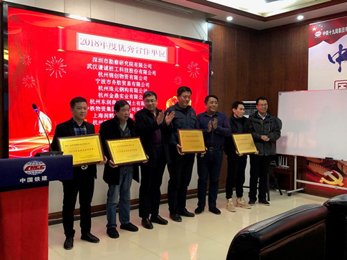 中鐵十九局集團(tuán)軌道交通工程有限公司副總經(jīng)理兼總包部項(xiàng)目經(jīng)理王樹才、項(xiàng)目書記劉旭東、常務(wù)副經(jīng)理胡雷為2018年度優(yōu)秀合作單位代表頒獎(jiǎng)
