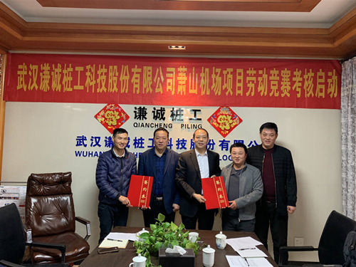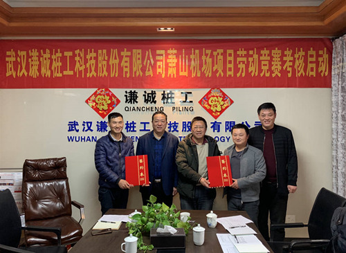李義勇副董事長主持儀式,宣布勞動競賽正式啟動并宣讀勞動競賽考核方案。陳黎斌、周強分別做動員講話。郭克誠董事長與指揮部代表李義勇、王延海,蕭山機場項目代表劉書平、魏東正式簽訂杭州蕭山機場項目目標承包協(xié)議書;陳黎斌主席代表工會與杭州工程指揮部及蕭山機場項目部簽訂勞動競賽考核協(xié)議。