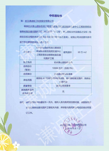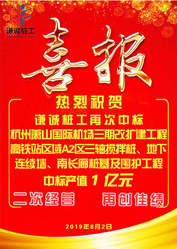 本站訊 繼2018年10月中標(biāo)蕭山機場三期改擴建工程高鐵項目A1區(qū)三軸攪拌樁、地下連續(xù)墻和立柱樁工程(下稱“一期項目”)后,8月1日,謙誠樁工杭州工程指揮部再次收到中建八局下達(dá)的中標(biāo)通知書,成功中標(biāo)高鐵站區(qū)域A2區(qū)三軸攪拌樁、地下連續(xù)墻,整個高鐵站區(qū)域坑內(nèi)三軸攪拌樁和高壓旋噴樁加固,南長廊圍護三軸攪拌樁和鉆孔灌注樁工程(下稱“二期項目”),新增工程內(nèi)容含稅產(chǎn)值約一億元。