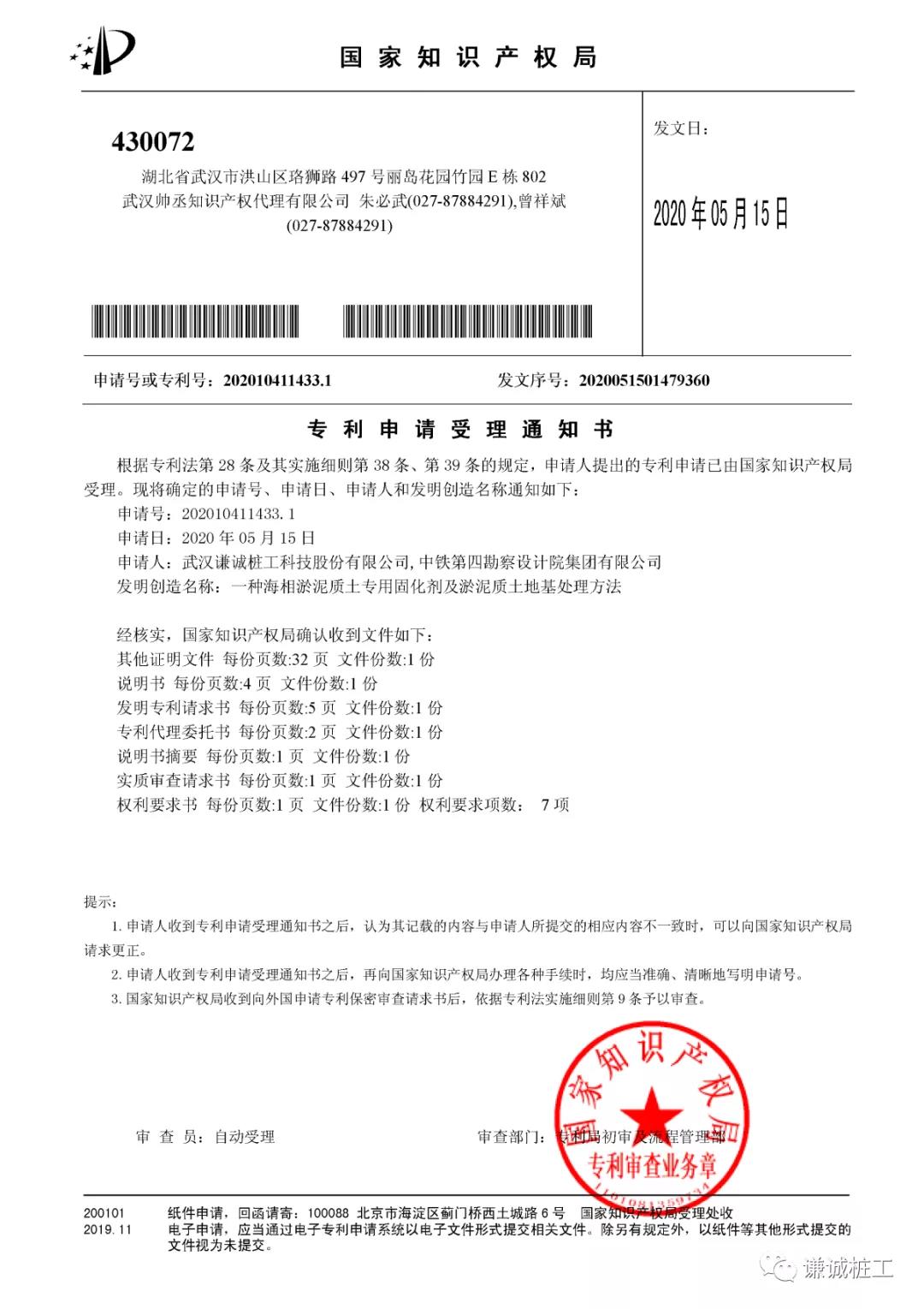 公司與鐵四院聯(lián)合研發(fā)“一種海相淤泥質(zhì)土專用固化劑及淤泥質(zhì)土地基的處理方法”發(fā)明專利獲國家知識(shí)產(chǎn)權(quán)局受理