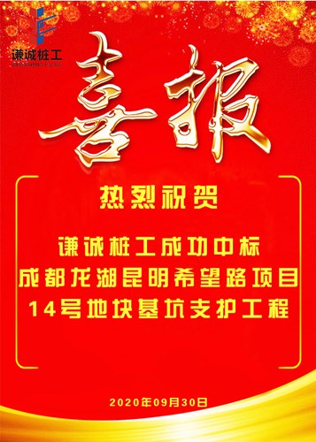 繼7月底中標(biāo)龍湖昆明希望路項(xiàng)目7號(hào)地塊樁基礎(chǔ)工程后,2020年9月30日,謙誠(chéng)樁工昆明分公司再次接到由“云南錦博置業(yè)有限公司”發(fā)出的中標(biāo)通知,成功中標(biāo)成都龍湖昆明希望路項(xiàng)目14號(hào)地塊基坑支護(hù)工程。